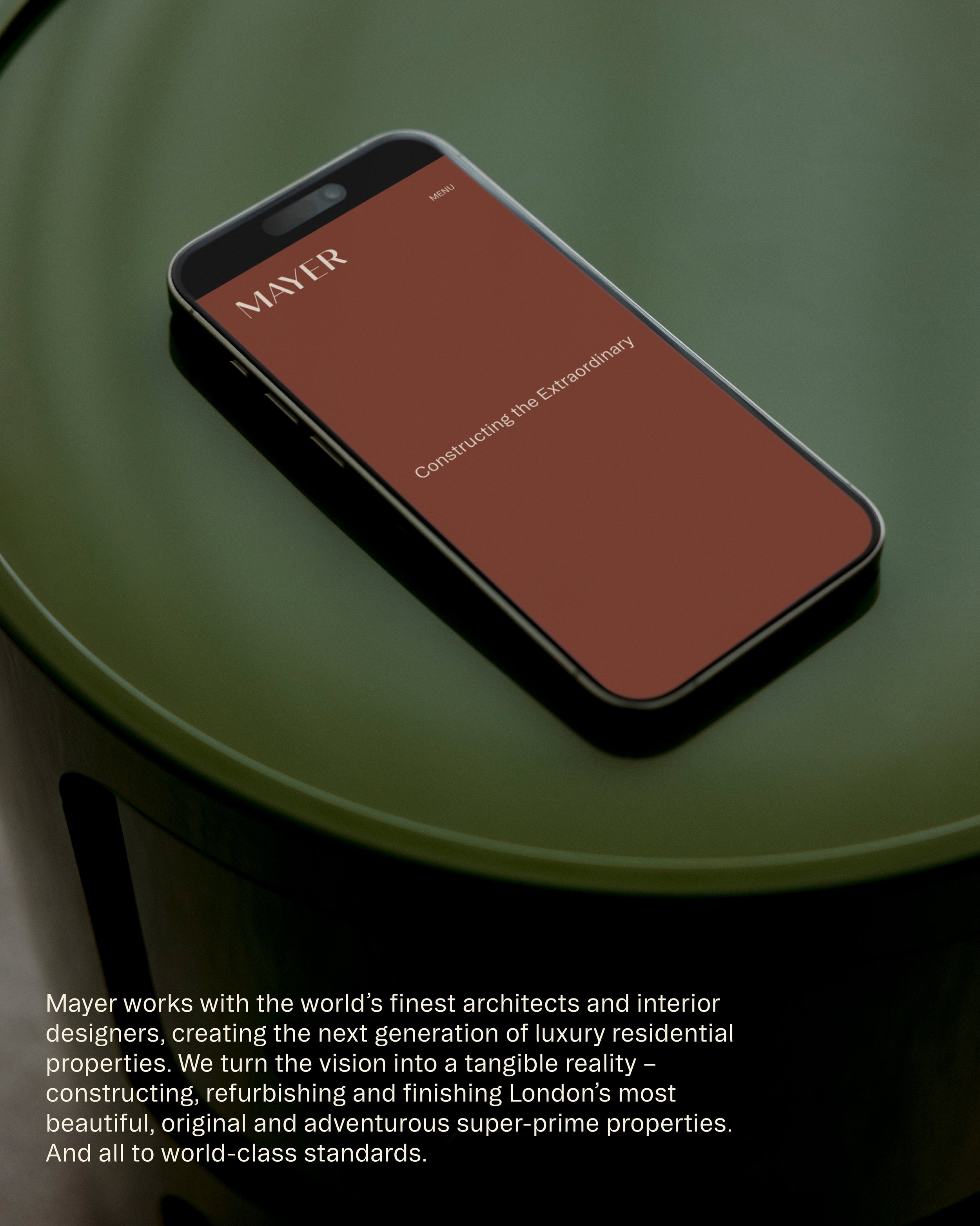 Mayer Construction is a high end London building company, trading successfully since 2012. The business has been working for high net worth clients but now wants to reach an ultra high net worth audience. This demands a brand that can compete at the highest levels, positioning Mayer as one of the construction companies in the capital.